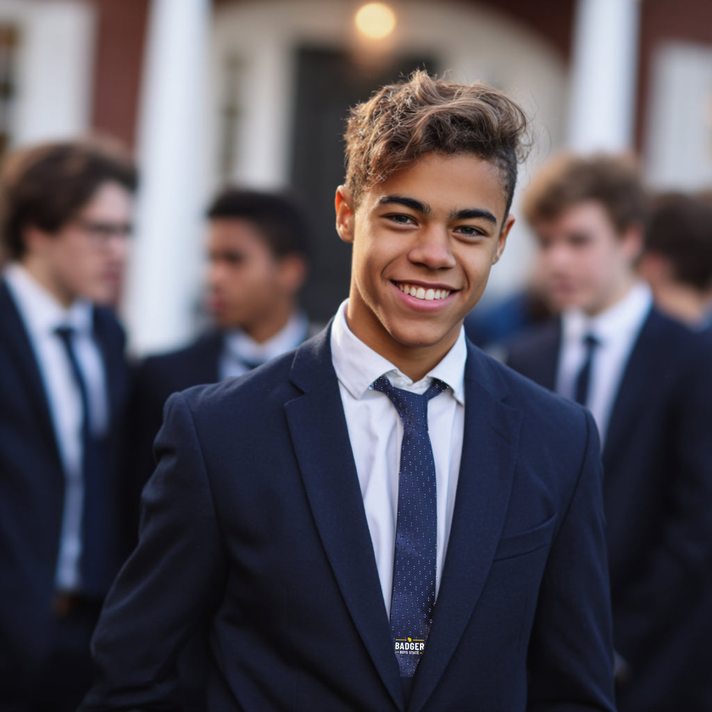 Elevate your formal look with this refined Badger Boys State necktie, designed for participants, alumni, and supporters who want to represent with subtle pride and timeless style. Crafted in a deep navy base with a clean microdot pattern, this tie strikes the perfect balance between classic sophistication and meaningful identity.